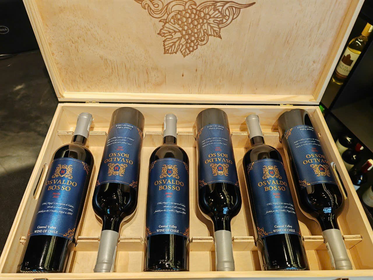 Set quà tặng hộp gỗ sáu chai vang Chile Osvaldo Merlot (nhãn xanh) tại RUMA sẽ bao gồm: