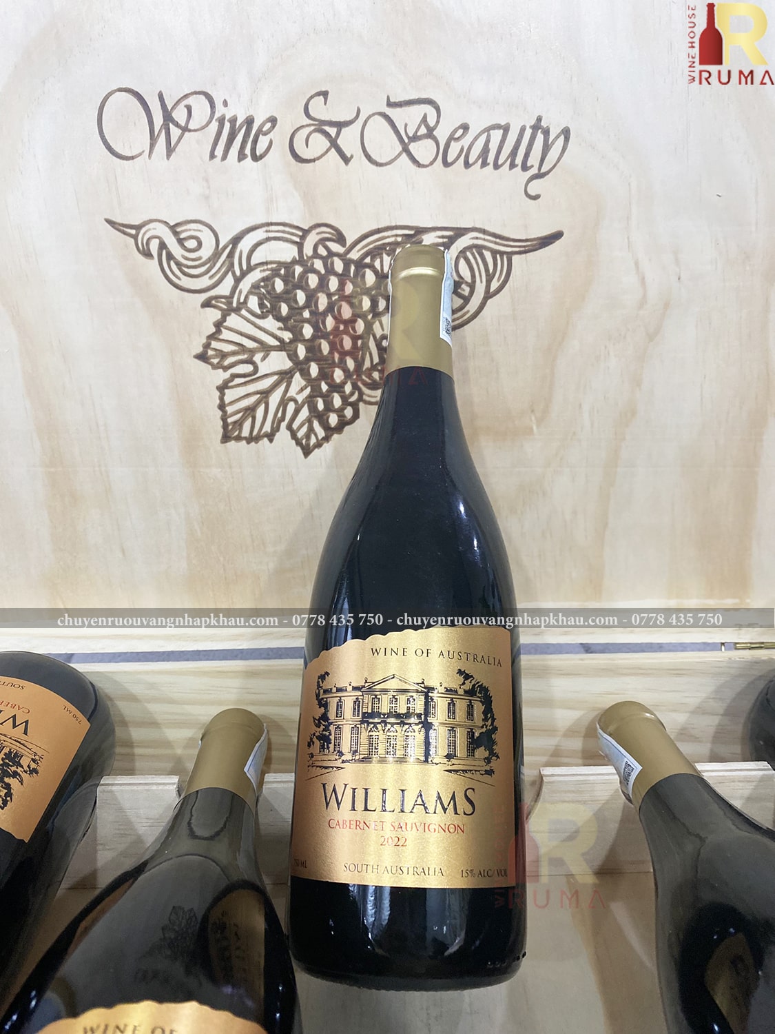 - Vang Úc Williams là mẫu rượu vang đỏ với nồng độ trung bình 15% được làm chính từ giống nho Cabernet Savignon - một giống nho phổ biến của các vùng sản xuất vang South Australia. Thiết kế đơn giản, nhã nhặn, lấy gam màu vàng ngà làm màu chủ đạo, dáng chai đậm nét đặc trưng nước Úc, sang trọng, thu hút.