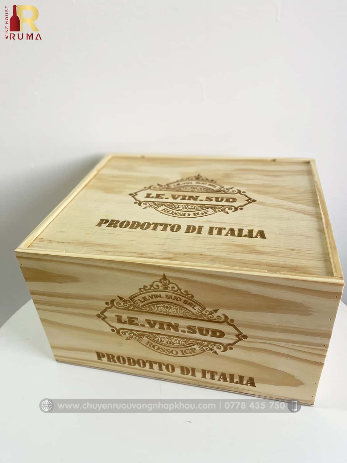 + Hộp gỗ đựng vang thiết kế 2 tầng: kích thước 35 x 30 x 25 cm chạm khắc hoạ tiết thương hiệu vang Ý "LE.VIN.SUD" nổi tiếng.