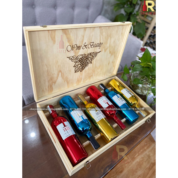 - 1 hộp gỗ nguyên tấm, thiết kế ngăn để chai vang chắc chắn, có khoá đóng mở tiện lợi. Hai bên thùng gỗ có 2 chỗ để tay thuận tiện cho việc di chuyển, bưng bê. Hộp gỗ có hai mẫu thiết kế phổ biến: