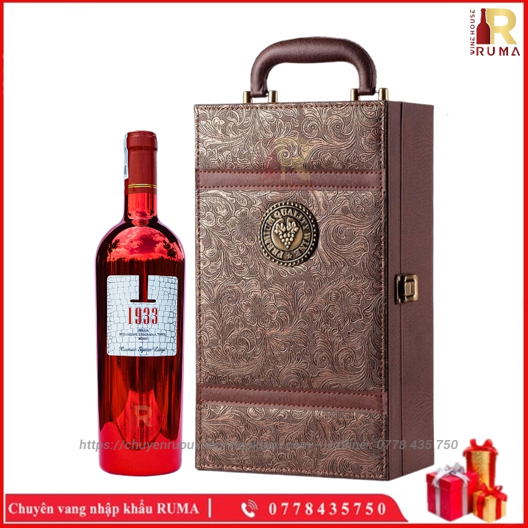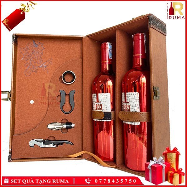 Set quà tặng hộp da hai chai vang Ý 1933 Ruby tại RUMA sẽ bao gồm: