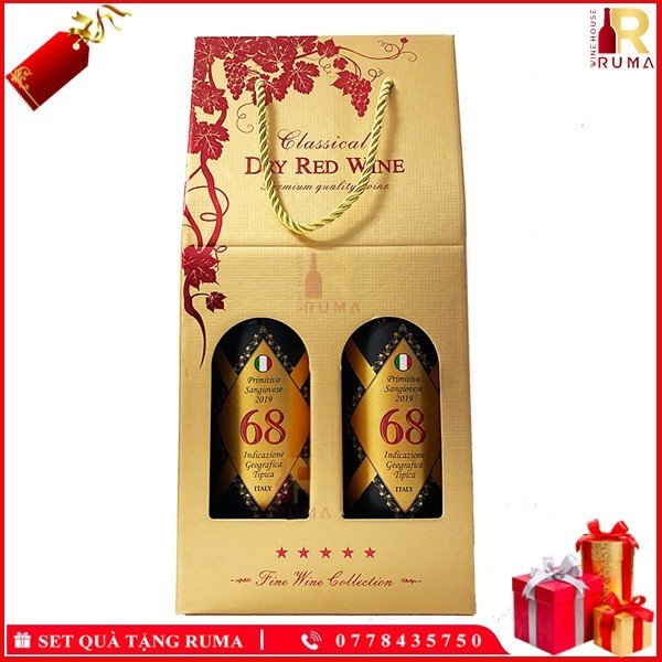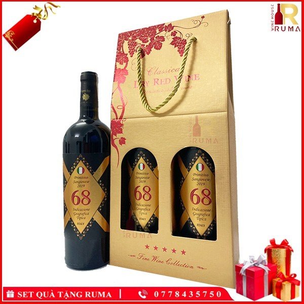 - Vang Ý 68 là mẫu rượu vang đỏ với nồng độ trung bình 14%, được làm từ 2 giống nho nổi tiếng Primitivo và Sangiovese.